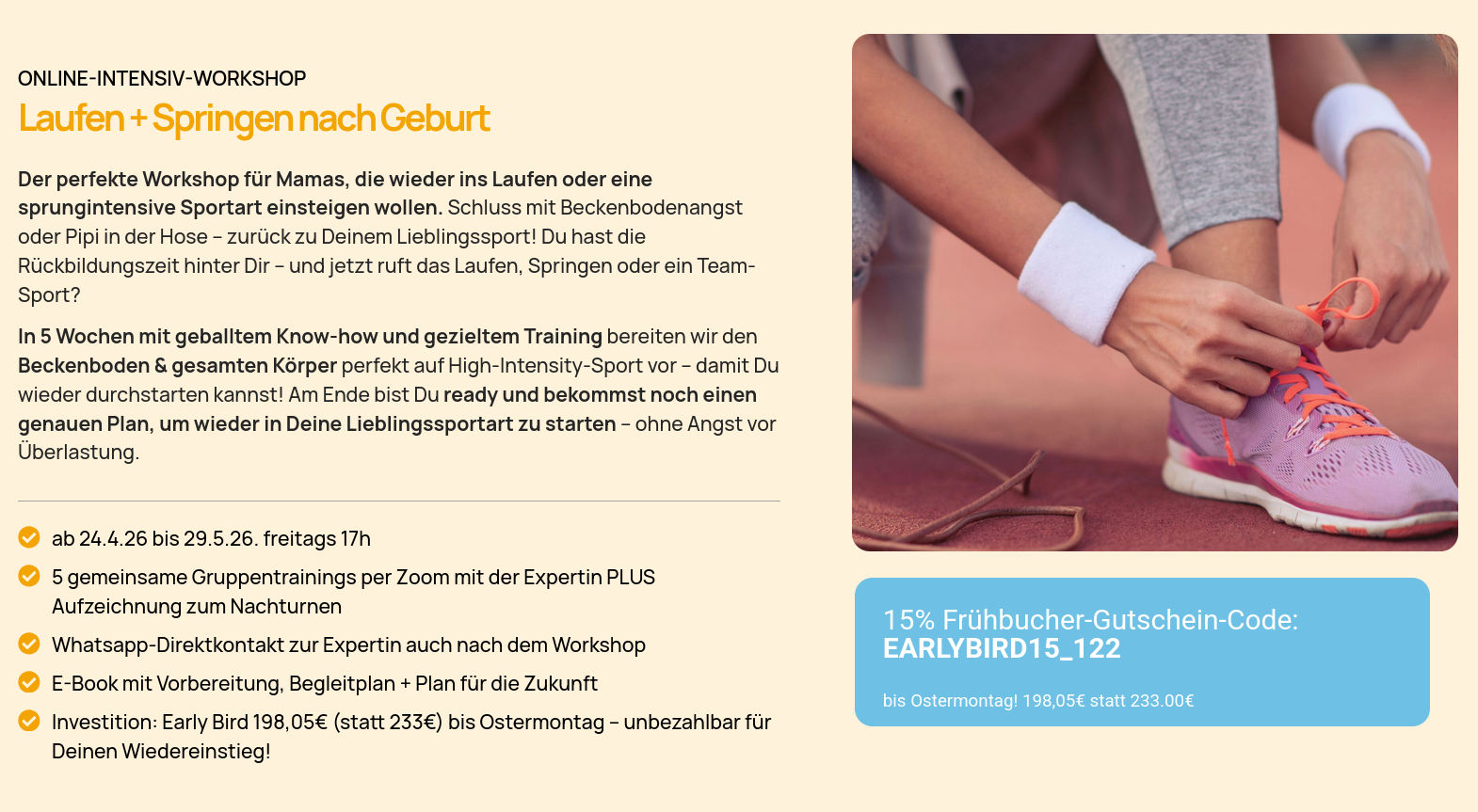 Am Freitag, dem 24.4., startet der nächste MamaWORKOUT Intensiv-Workshop “Fit für’s Laufen und Springen nach der Geburt”. Über 5 Wochen treffen wir uns online von 17:00-18:00Uhr. Der Kurs ist für alle Mamas, die nach der Geburt und Rückbildung wieder mit intensiveren Sprungbelastungen beginnen wollen.